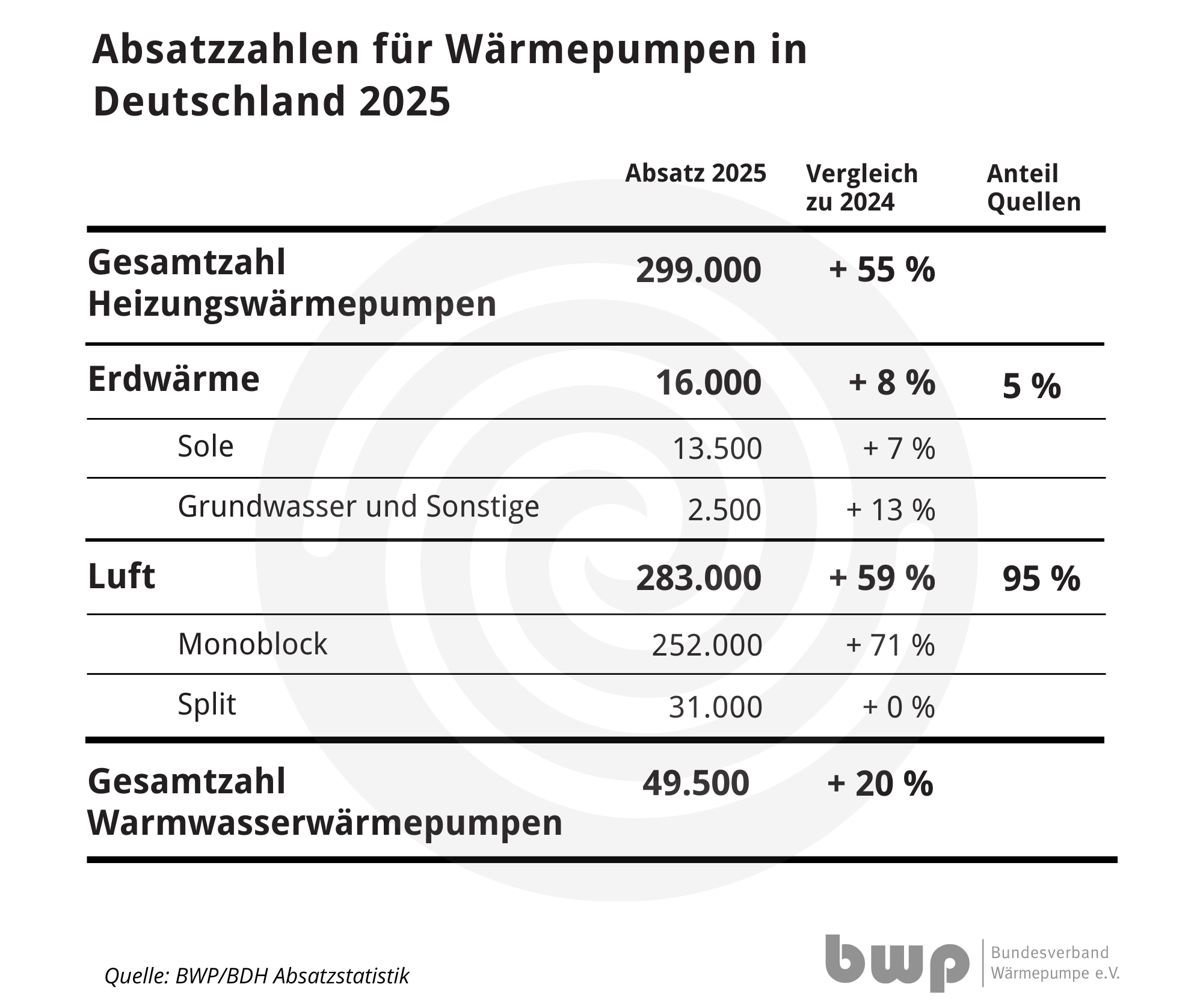 Die Wärmepumpen-Branche vermeldet ein erfolgreiches Absatzjahr 2025: Mit 299.000 Heizungs-Wärmepumpen stieg der Absatz gegenüber dem Vorjahr um 55 Prozent. Auch die Förderanträge für Wärmepumpen sind im Vergleich zum Vorjahr deutlich angestiegen. Der Verband hält es angesichts weiter sinkender Nachfrage nach Öl- und Gasheizungen für notwendig, den Aufwärtstrend bei Wärmepumpen zu verstetigen, um den deutschen Wirtschaftsstandort zu stärken. Dies setze aber voraus, dass in den aktuellen Verhandlungen um das Gebäudeenergiegesetz ein ambitionierter, planbarer Rahmen erhalten und auch die Heizungsförderung in ihrer jetzigen Form bestehen bleibe.