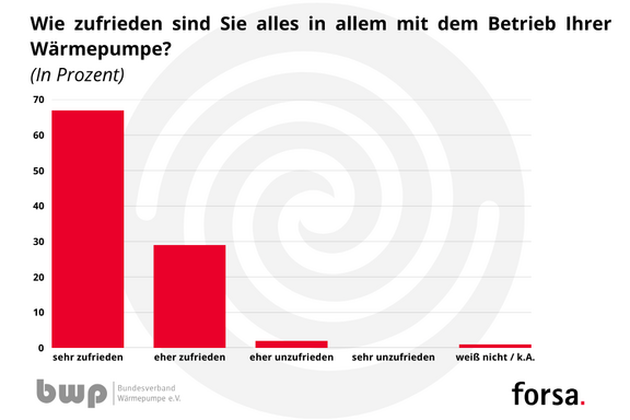 Dass die Kunden in großer Zahl mit der Qualität der installierten Wärmepumpen zufrieden sind, zeigt eine neue Umfrage des Meinungs- und Marktforschungsinstitutes forsa: „Besitzer von Wärmepumpen, die ihre Öl- oder Gasheizung ersetzt haben, weisen insgesamt eine sehr hohe Zufriedenheit mit ihren Geräten auf“, so Forsa-Geschäftsführer Thorsten Thierhoff. Das Institut hat 794 Hausbesitzer befragt, die sich beim letzten Heizungstausch im Gebäudebestand für eine Wärmepumpe entschieden haben. Davon sind 67 Prozent mit dem Betrieb ihrer Wärmepumpe sehr zufrieden und 29 Prozent eher zufrieden – nur zwei Prozent sind unzufrieden, so Thierhoff: „96 Prozent, also nahezu alle befragten Hausbesitzer mit Wärmepumpe würden sich rückblickend erneut für eine Wärmepumpe entscheiden.“