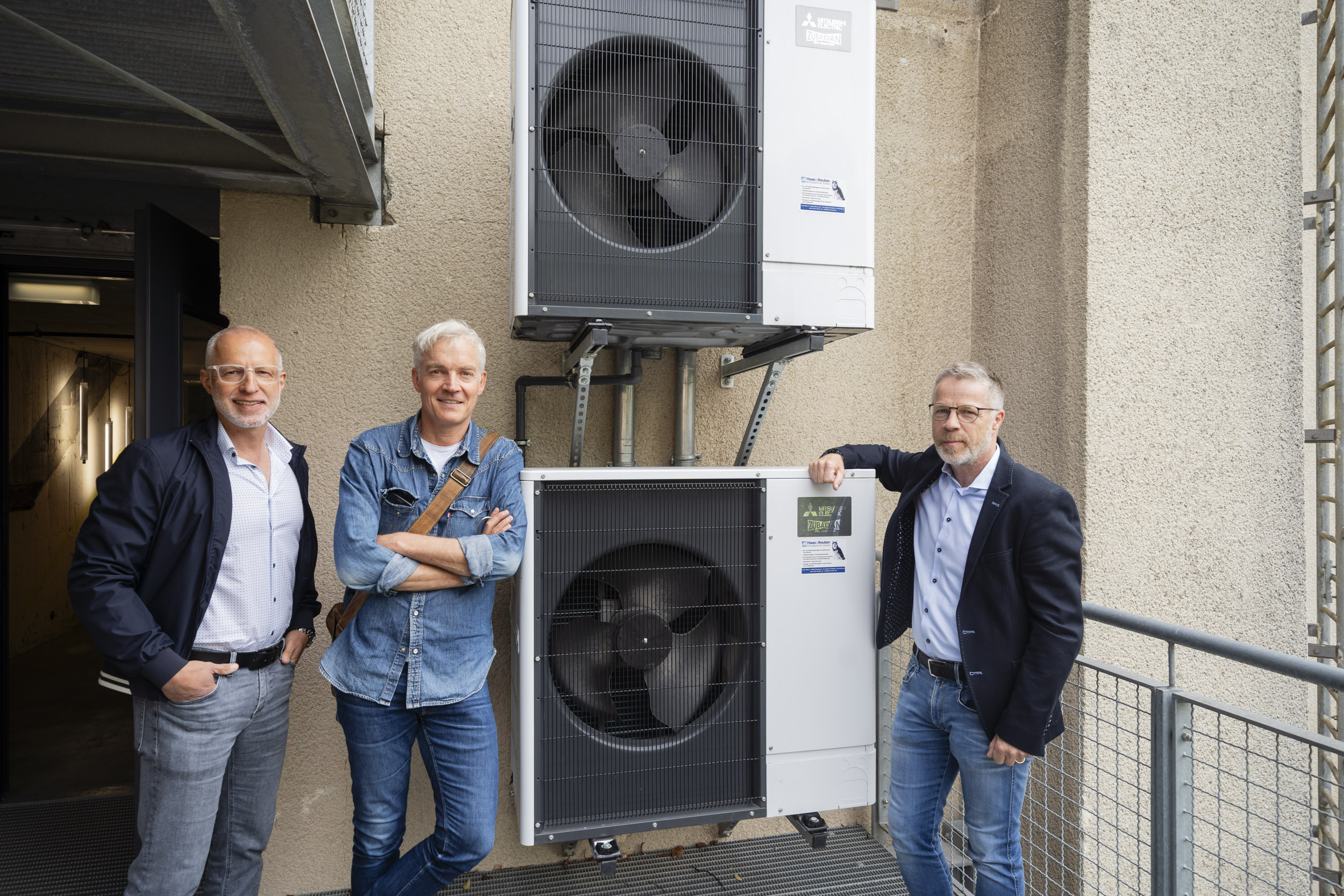 Auch die Heiztechnik war den Architekten der Zentralbau GmbH aus Düsseldorf wichtig. Das beauftragte Planungsbüro PBS Energiesysteme aus Haan entschied sich für Luft-Wasser-Wärmepumpen in Kaskadenschaltung. Für den Wohnbereich wurde eine 2er Wärmepumpen-Kaskade (Ecodan PUHZ-SHW112YAA) mit insgesamt 22,4 kW von dem Neusser Wärmepumpenspezialisten Haas & Reuten Klimatechnik GmbH installiert. Damit können die Wohnkuben beheizt und gekühlt werden. Wärmeverteilung in den Wohnungen erfolgt über Fußbodenheizung.