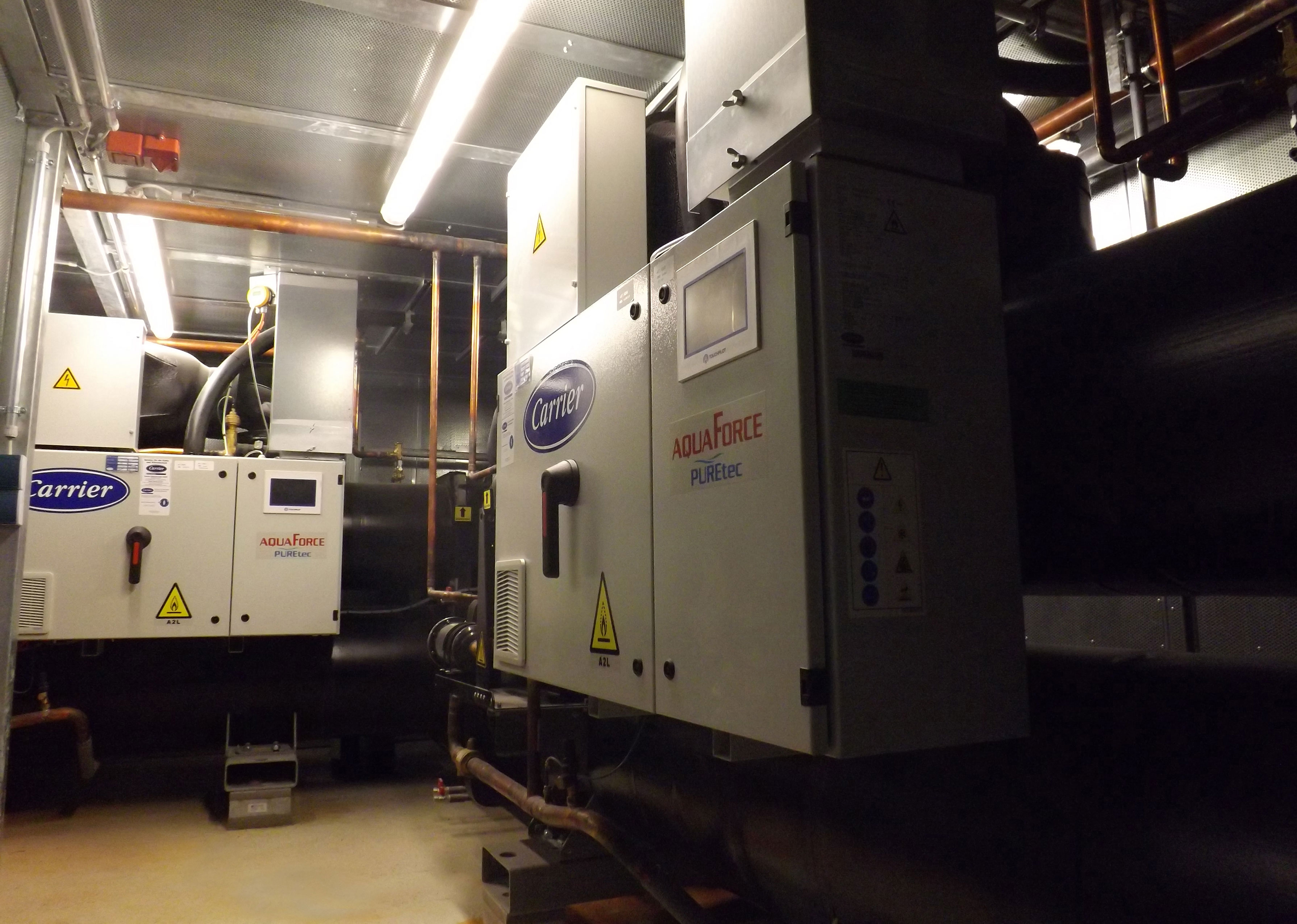 Insgesamt werden 13 Gebäude mit umweltfreundlicher Wärme versorgt. Der spezielle Kniff an der Anlage: Die Verflüssiger der beiden Wärmepumpen sind in Reihe miteinander verrohrt. Die erste hebt die Temperatur von 40 auf 60 °C, die zweite erledigt den Rest der Temperaturdifferenz. Der Hersteller Carrier entwickelte dafür eine projektspezifische Regelung. In der gewählten Anordnung erreichen die Wärmepumpen einen Wirkungsgrad von 4, d.h. aus 1 kW elektrischer Energie werden 4 kW Wärme erzeugt.