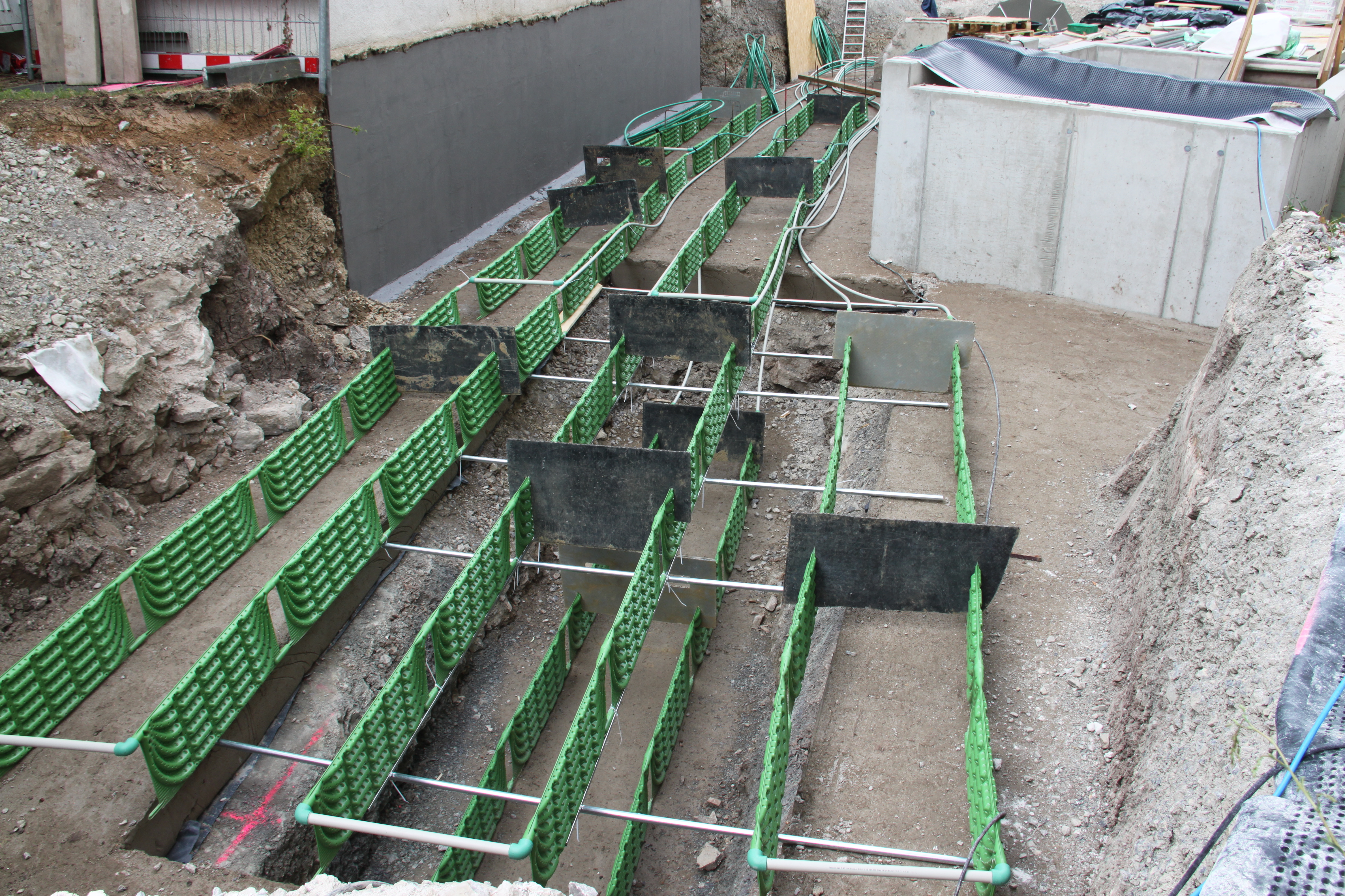 Einst diente der stattliche Fachwerkbau als Lager für den Zehnten der Landbevölkerung sowie als Kelter. Umfangreich saniert und umgebaut wird das historische Gebäude ab Sommer 2026 zum Museum, Veranstaltungsort, Café und Tourist-Info. Damit der Gigant unter den örtlichen Fachwerkbauten keine gigantischen Heizkosten und Treibhausgase verursacht, wurden als zentrales Heizsystem zwei Solewärmepumpen und ein Kollektorfeld von GeoCollect installiert. Die zweilagig verlegten Kollektorstränge nutzen den knappen innerstädtischen Raum optimal aus. Innovativ: Dank der Verfüllung der Kollektoranlage mit Flüssigerde entsteht ein unsichtbarer Energiemonolith mit optimalem Wärmeübergang zum erneuerbaren Heizen und Kühlen.