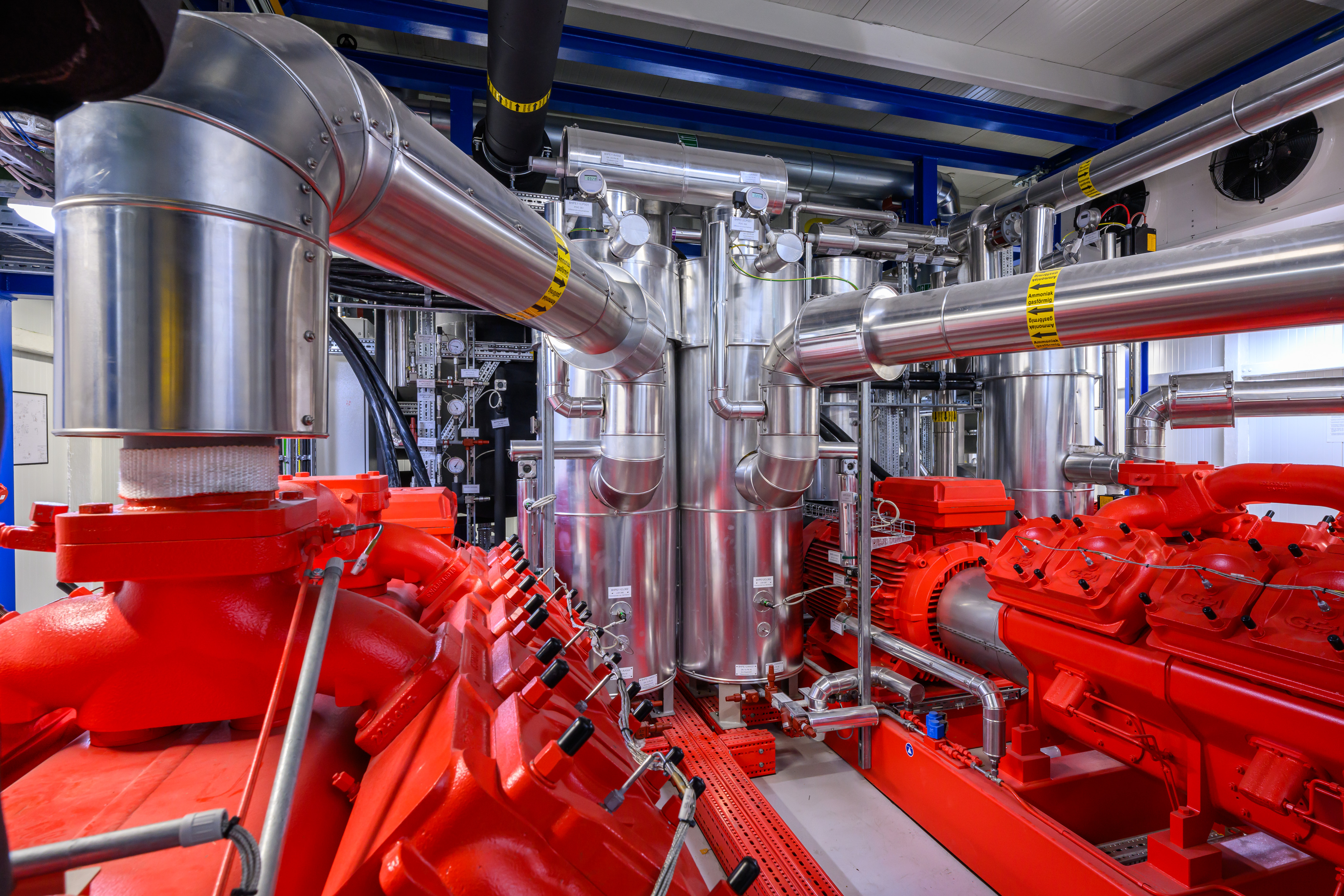 Die Wärmepumpe wurde im Werk gefertigt und auf einem Stahlrahmen auf die Baustelle angeliefert und angeschlossen.