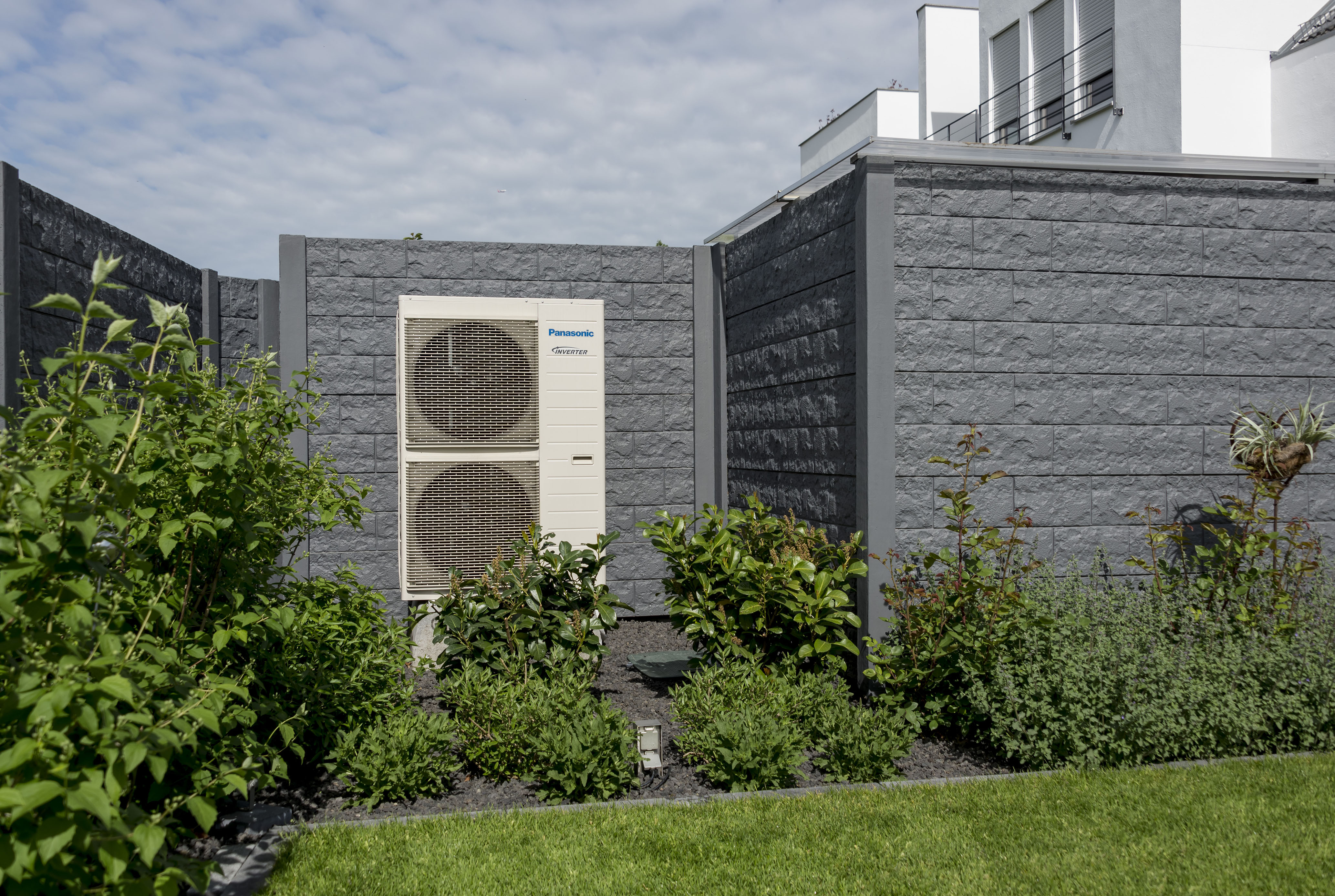 Die Bereitstellung der Raumwärme und die Erwärmung des Dusch- und Trinkwassers werden von einer Luft-Wasser-Wärmepumpe übernommen. Hierbei handelt es sich um ein Splitsystem: Das Außengerät steht im Garten und das zugehörige Hydromodul im Haustechnikraum. Die Wärmeverteilung erfolgt über eine Fußbodenheizung. Zusätzlich funktioniert die Wärmepumpe auch im Umkehrbetrieb, so dass sie im Sommer auch kühlt.