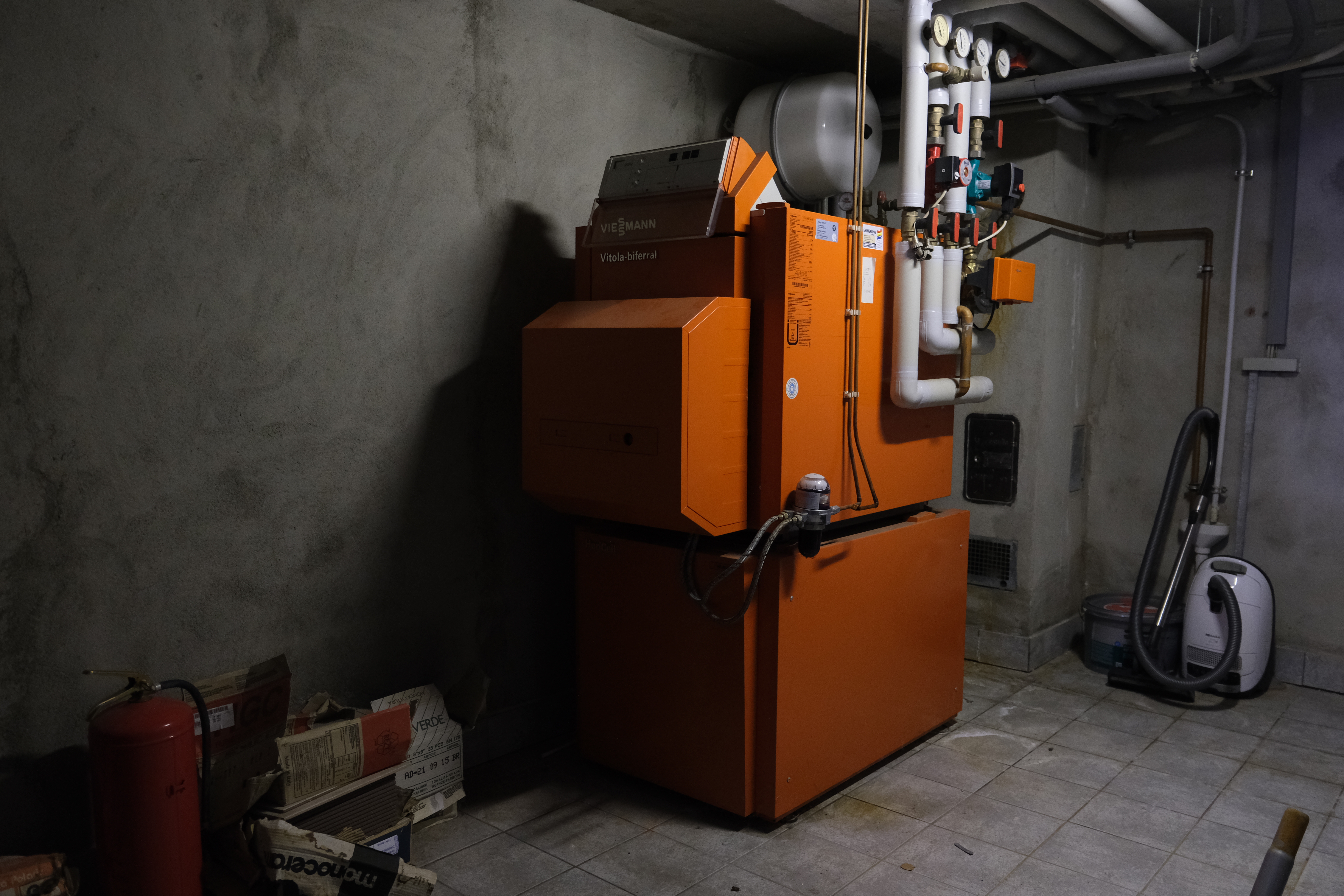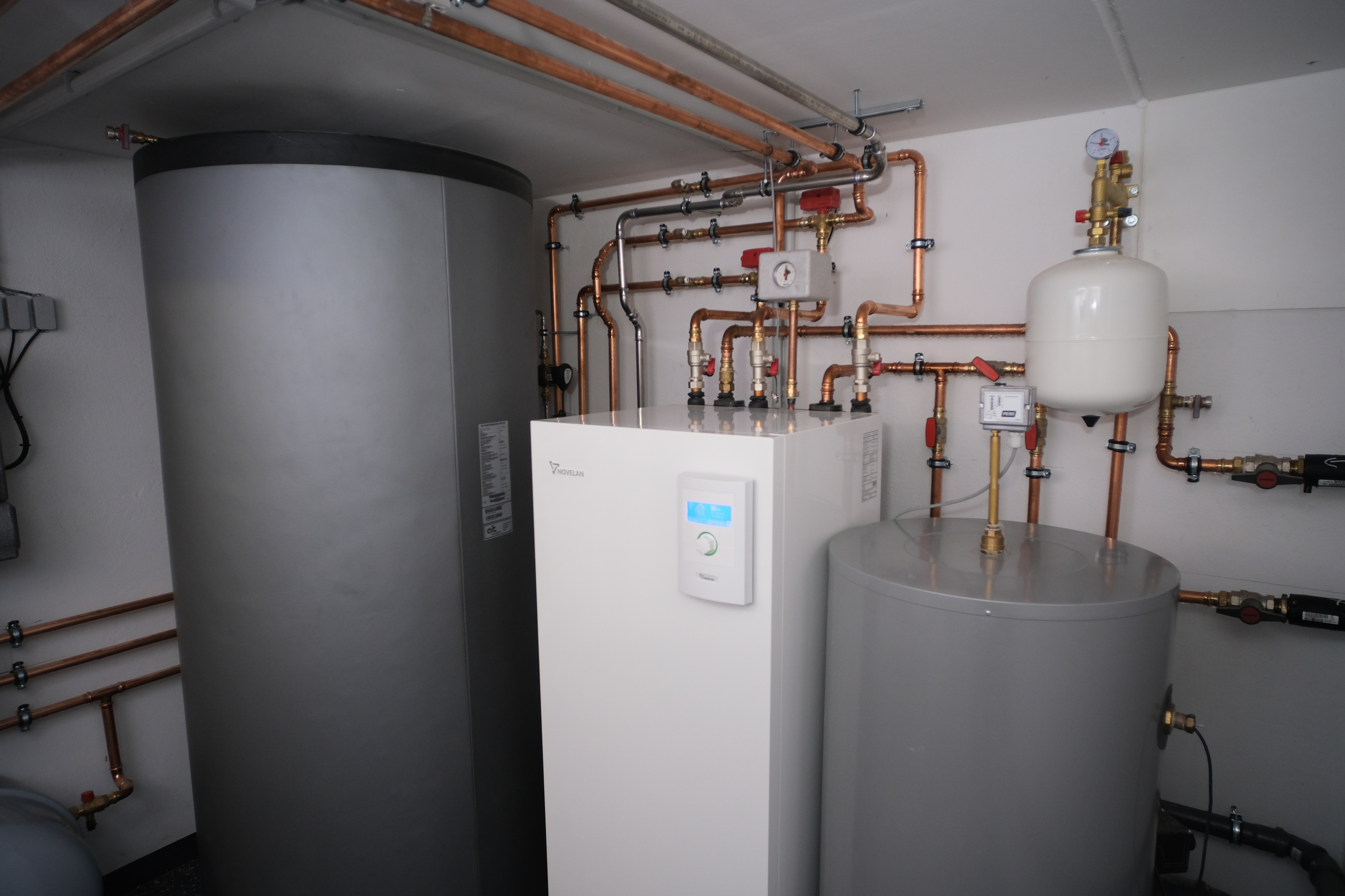 Auch die Wärmeverteilung - Fußbodenheizung im Erdgeschoss und Heizkörper im Obergeschoss - wurde im Originalzustand beibehalten. Die Wärmepumpe wird von 4 Erdsonden mit einer Tiefe von je 66m mit Erdwärme versorgt. Sie hat auch eine passive Kühlfunktion, um das Haus an heißen Sommertagen kostengünstig zu temperieren, in dem sie die Wärme aus dem Gebäude ins Erdreich abführt. Die neue Heizungsanlage befindet sich im ehemaligen Öl-Tankraum, so dass der frühere Heizungsraum jetzt anderweitig genutzt werden kann.