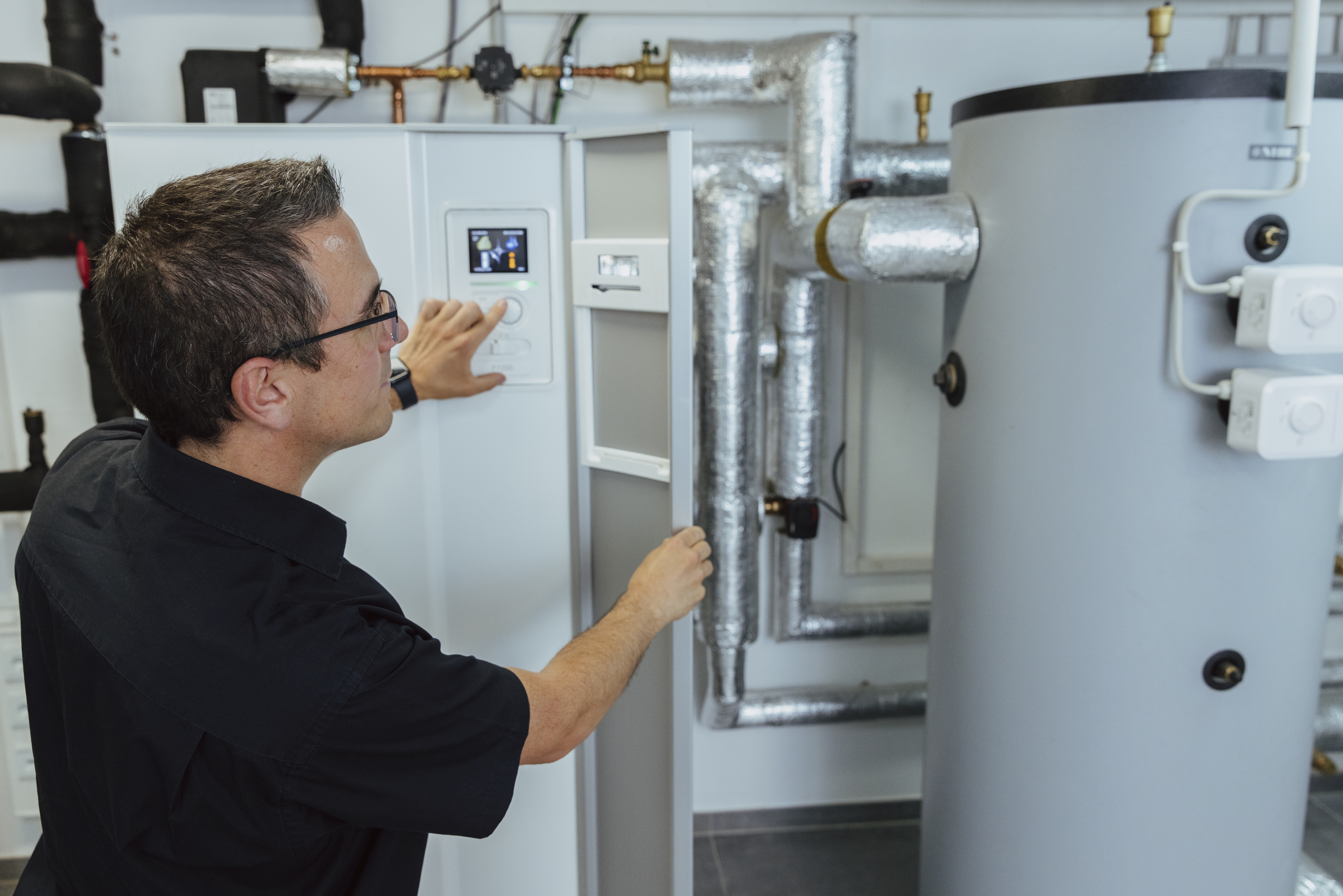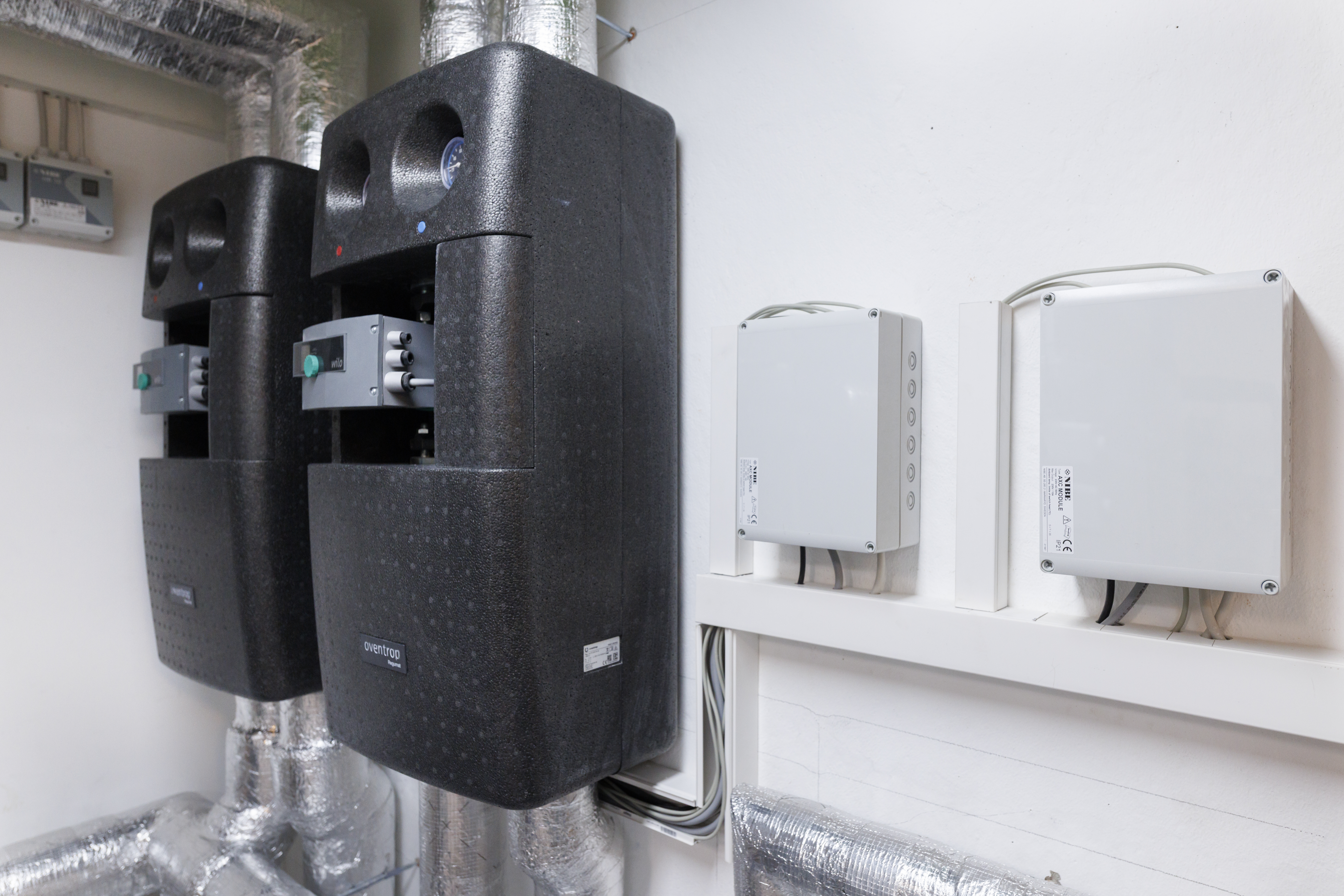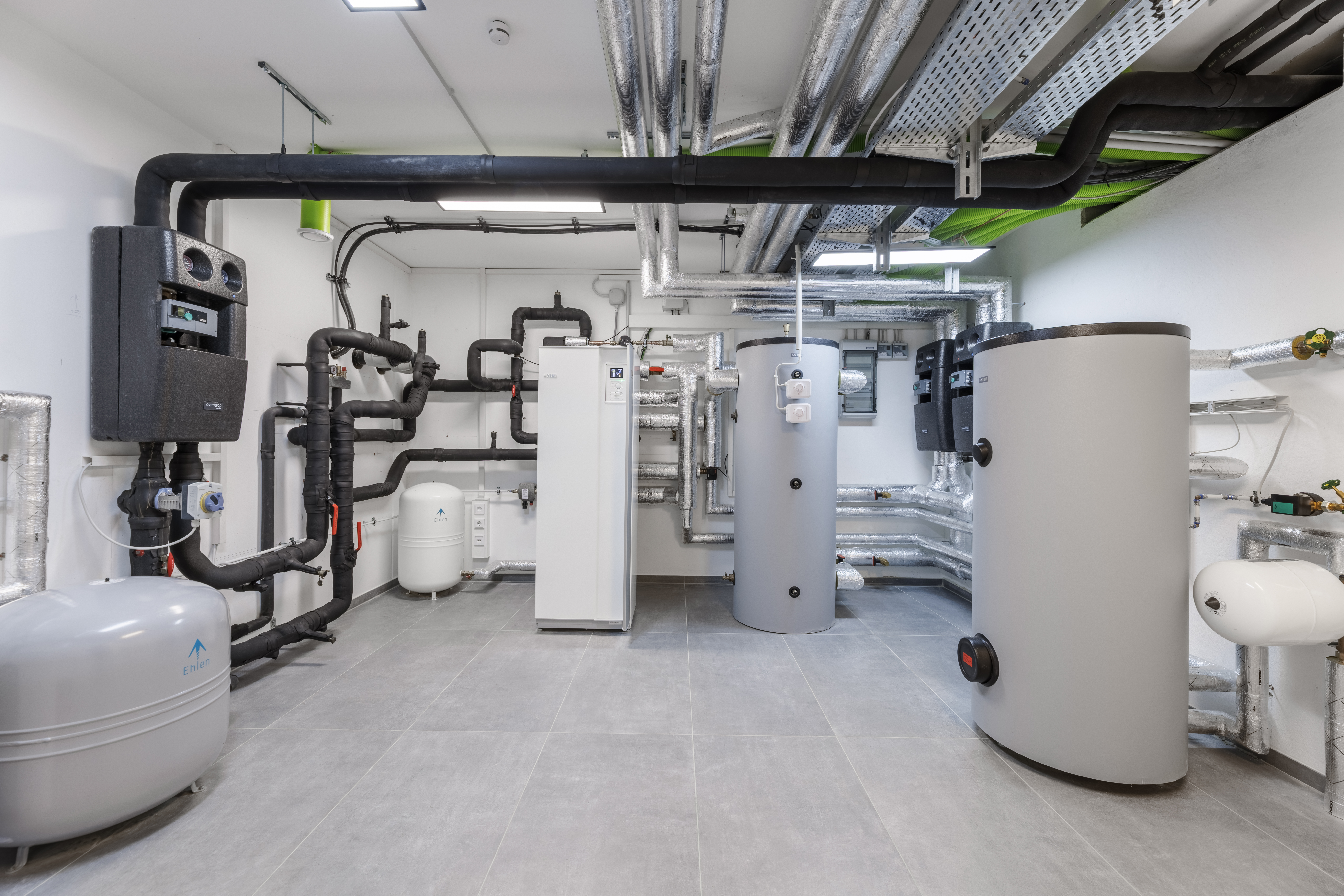 In Wiesbaum wurde ein neues Verwaltungsgebäude mit Werkstatt und Lagerflächen auf rund 1.500 Quadratmeter Nutzfläche mit einem geothermischen Gesamtsystem ausgestattet. Herzstück der Anlage ist eine Sole/Wasser-Wärmepumpe NIBE F1355-43 mit zwei modulierenden Verdichtern, die Heizung und Warmwasser zentral bereitstellt. Als Wärmequelle dienen acht Erdsonden mit jeweils 250 Metern Tiefe unter dem Parkplatz. Ergänzt wird das System durch einen 500-Liter-Pufferspeicher, einen 550-Liter-Warmwasserspeicher, dezentrale Lüftungsgeräte mit Wärmerückgewinnung und eine Photovoltaikanlage mit 100 kWp. Im Sommer nutzt das Gebäude passive Kühlung über Fußbodenheizung und Gebläsekonvektoren. Eine dachseitige Wetterstation steuert zusätzlich die Verschattung zur Reduzierung des Kühlbedarfs. So entsteht ein wirtschaftliches und ganzjährig effizientes System für Verwaltung, Werkstatt und Lager.