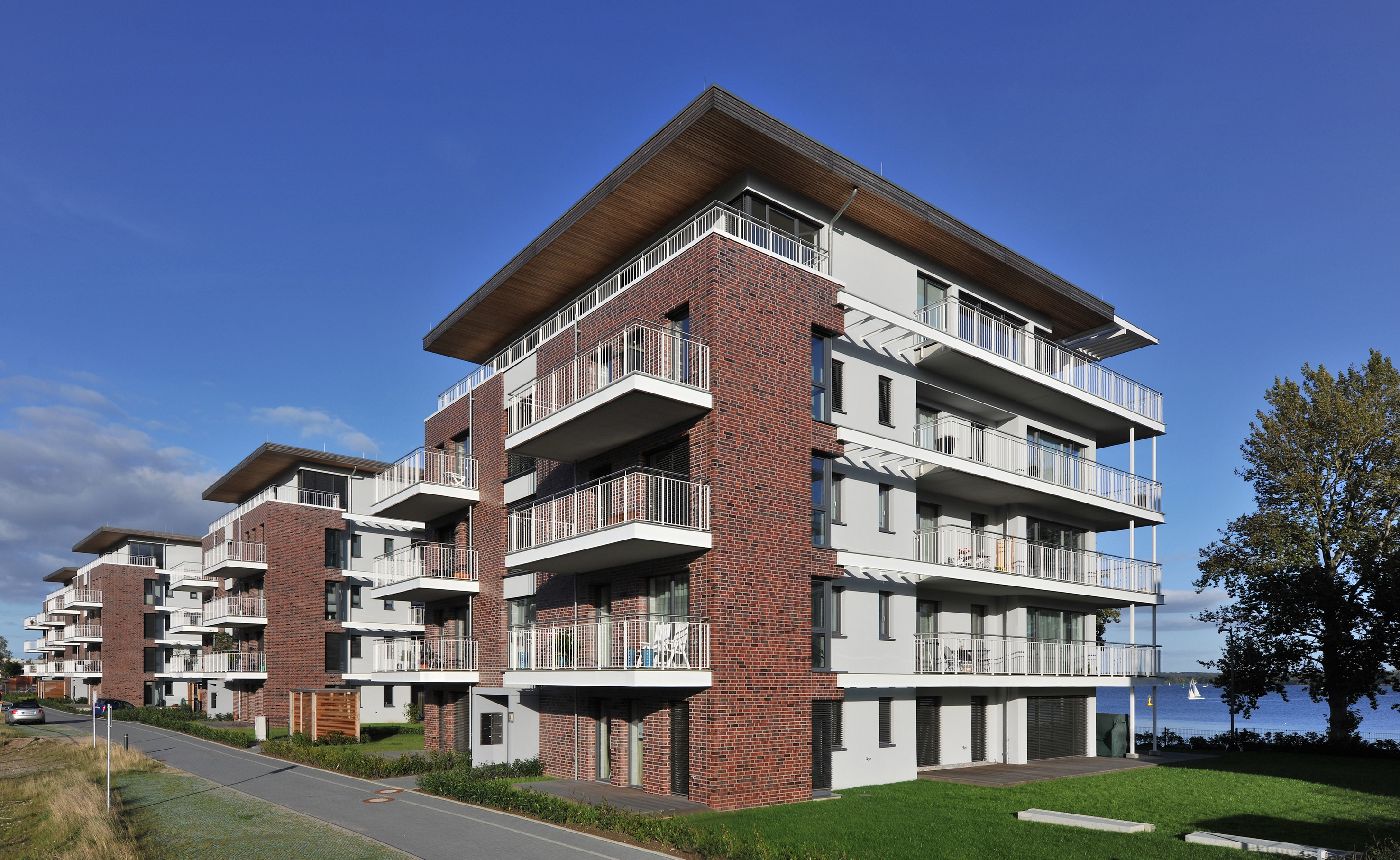 Die fünf Wohnhäuser mit je 9 Wohnungen und einer Fläche von 1054 Quadratmetern liegen direkt an der Kieler Förde und werden mit je einer 50 kW Sole-Wasser-Wärmepumpe für Heizung und Warmwasser versorgt. Als Energiequelle dienen neben 4 Doppel U-Sonden (100 m / 32 mm) je 56 statische Betonpfähle, die als Energiepfähle ausgebildet wurden. Diese haben eine durchschnittliche Länge von ca. 13 Metern.