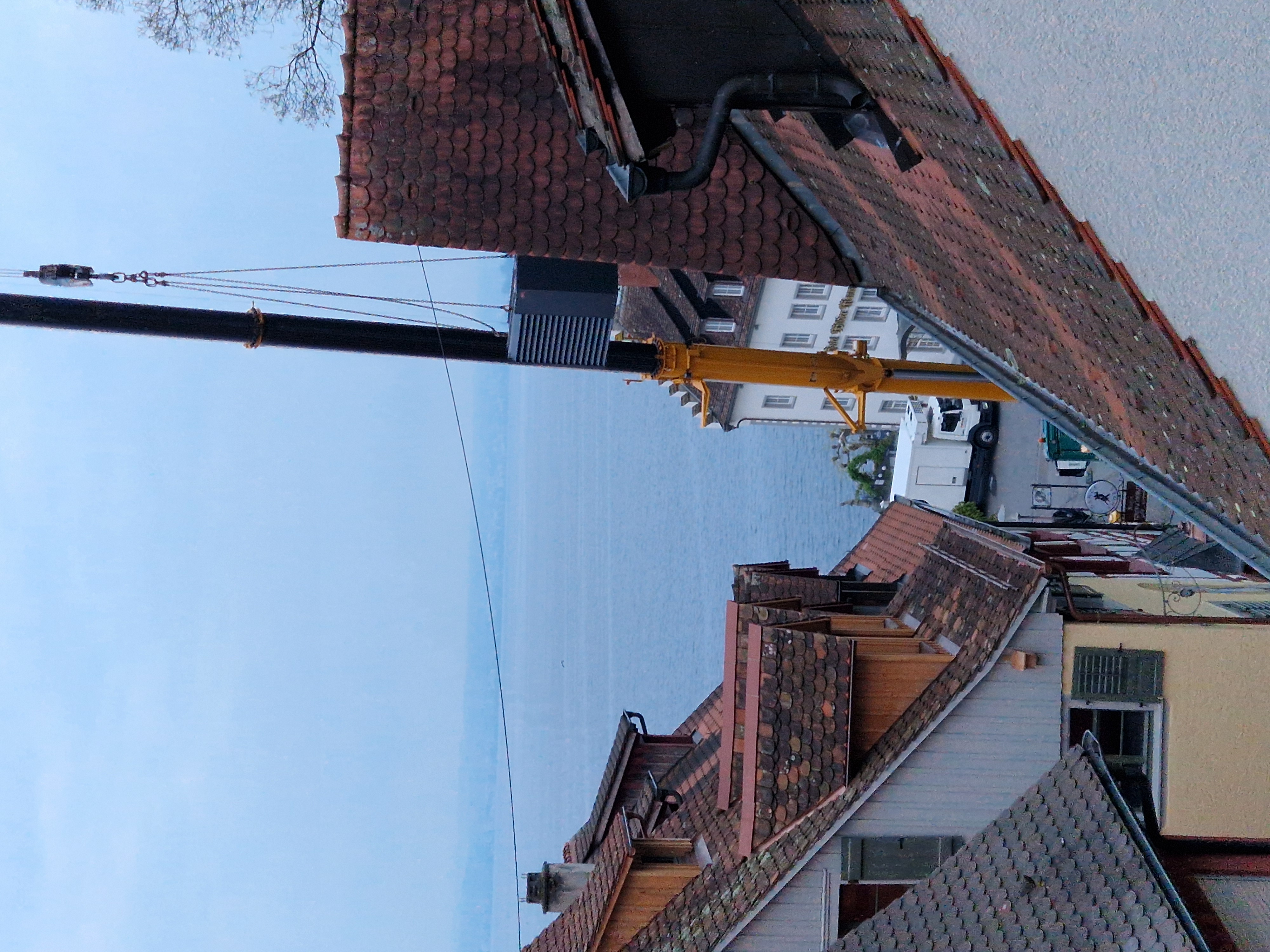 Im dicht bebauten, denkmalgeschützen Bereich der Meersburger Altstadt war es schwierig, einen passenden Stellplatz für eine Luft-Wasser-Wärmepumpe zu finden. Der Hausbesitzer hat sich für einen Platz hinter dem Haus an einem Felsen entschieden. Dazu musste die Wärmepumpe von einem Autokran über die Häuserzeile gehoben werden.
